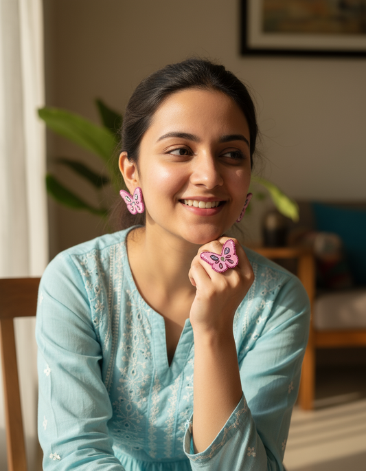 🦋 Handmade Butterfly Jewelry Set – Stud Earrings & Matching Ring
